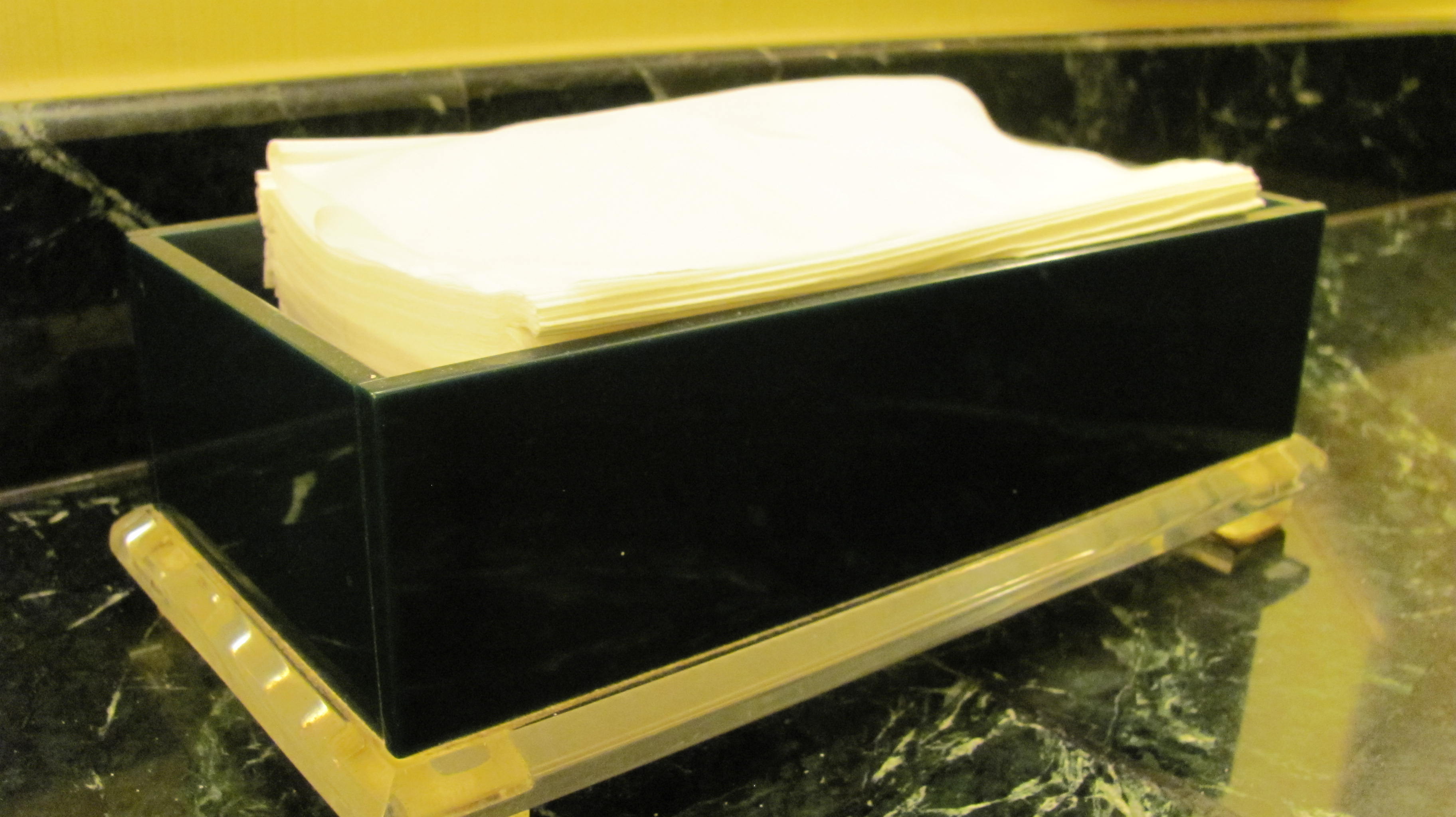 In the Barclay’s lobby bathroom, where someone takes tissues out of the box for you and refolds them.